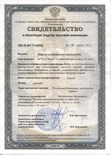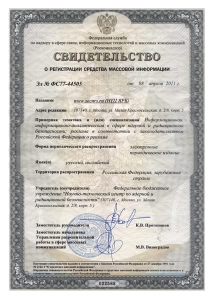 Свидетельство о регистрации средства массовой информации (сайт <a href="https://www.secnrs.ru">ФБУ «НТЦ ЯРБ»</a>).