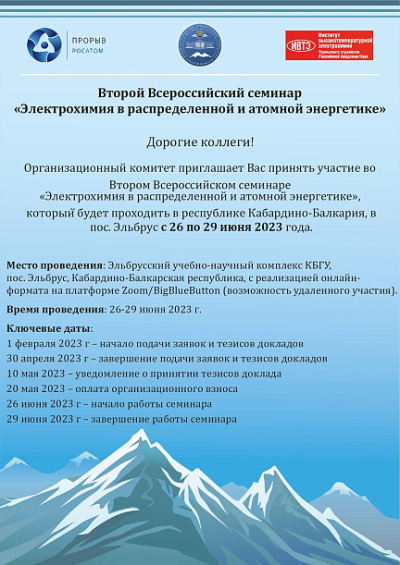 С 26 по 29 июня 2023 г. на базе Эльбрусского учебно-научного комплекса Кабардино-Балкарского Государственного университета им. Х.М. Бербекова, пос. Эльбрус состоялся Второй Всероссийский семинар «Электрохимия в распределенной и атомной энергетике». Организаторами семинара являлись АО «Прорыв» г. Москва, Кабардино-Балкарский Государственный университет им. Х.М. Бербекова (КБГУ), г. Нальчик и Институт высокотемпературной электрохимии УрО РАН (ИВТЭ УрО РАН), г. Екатеринбург.