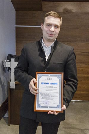 Доклад Емельянова А. С. «Исследование термической стабильности сорбента КУ-2*8 в контакте с азотной кислотой в изохорных условиях» был высоко оценен комиссией ИБРАЭ РАН, а самому докладчику директор ФБУ «НТЦ ЯРБ» Хамаза А. А. лично вручил Почётную грамоту.